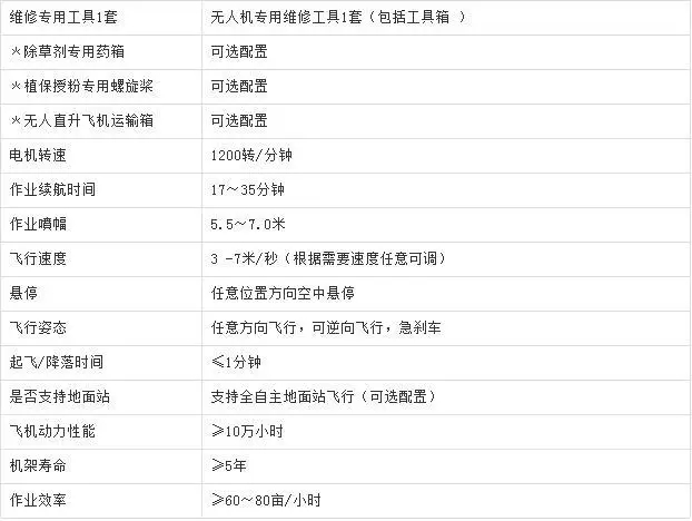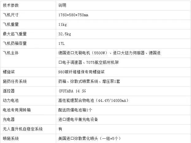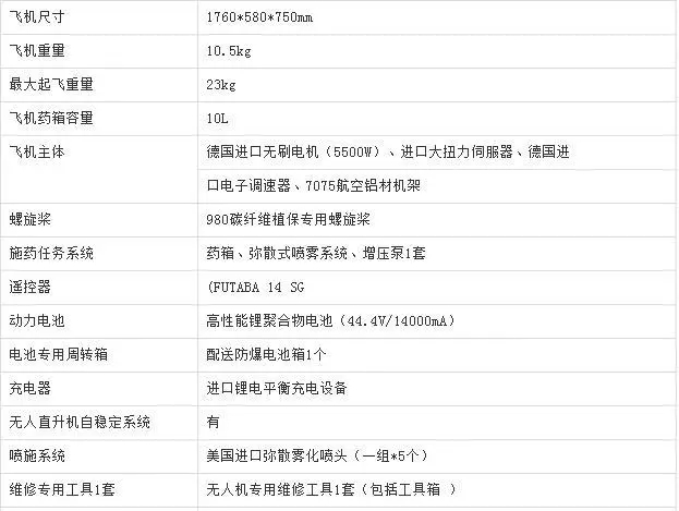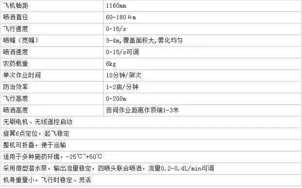 ❖产品亮点:机身:机体采用航空铝合金及进口碳纤维材料,重量轻、强度高、耐腐蚀;产品设计合理,气候适应度高,寒暑地带均正常使用;使用普及时间长,售后服务网络遍布全国;坚固耐用,整机使用超过1500次,产品性能不变;喷药系统布局先进,避免重复喷药,减少农药残留,创造更高价值。