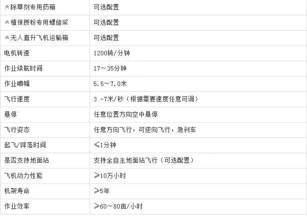 ❖产品亮点:锂电池驱动 ,飞机重量轻,一人可独自搬运;智能傻瓜式操作,简单易学,包学包会;德国进口无刷电机,免维护;提高杀虫效率达90%以上;节水90% ,节药40%以上;每小时作业面积最高可达60亩;适应任何作业环境(深水田、丘陵、高山、灌木);用途广(施药、施肥、除草剂、制种授粉);下压风场大,药物能有效穿透和覆盖农作物根部;人身安全有保障(遥控作业远离药害);对作物无机械性破坏。
