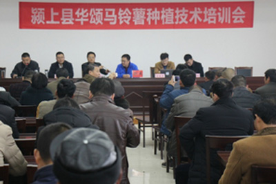 为进一步提高马铃薯种植水平,加快颍上县马铃薯高产栽培新技术的推广,增加农民收入,12月14日,由安徽华颂农业科技有限公司、红星镇人民政府承办的颍上县华颂马铃薯种植培训会在红星现代农业服务中心举行。颍上县农委、华颂种业(北京)有限公司相关负责人,以及全县各农业综合服务站站长、种植大户、马铃薯种植相关知名企业负责人共200余人参加了本次培训会。